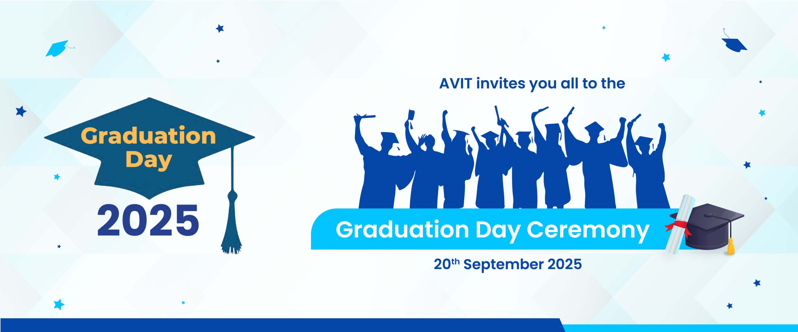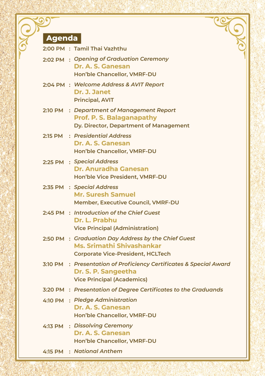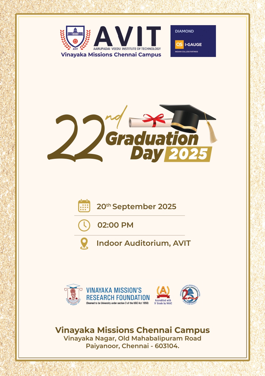 Candidates are directed to bring proof of identity. Candidates are requested to register their presence in the campus and enrollment in the AVIT Campus between 9.00 a.m. and 12.00 noon (including those registered online). Candidates should sit in the allotted seats by 1.30pm sharp with formal dress, shoes, robe and hood. Students with informal dress will not be permitted into the Graduation Hall.
